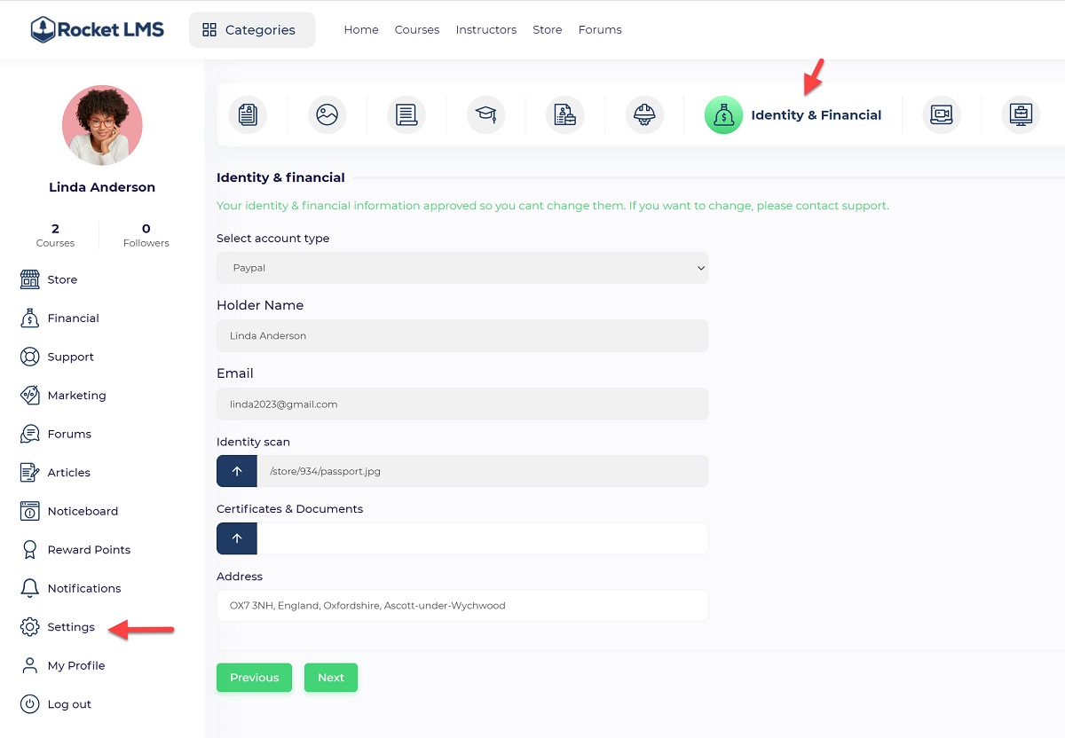 Users can define their payout account information from the “User Panel/ Settings/ Identity & Financial” menu.