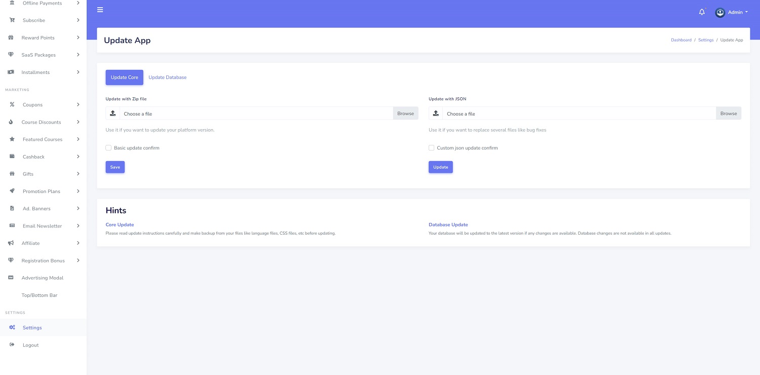You need to update your platform files and database after releasing each update. You can update your platform files using the first tab. You will find an “auto-update.zip” file inside the “Update” folder in the package that you downloaded from Codecanyon.