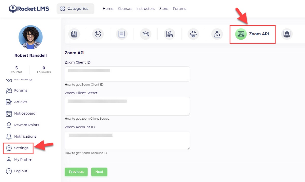 Each instructor should get Zoom Client ID,Client Secret and Account ID from Zoom App Marketplace and define it in the profile settings.