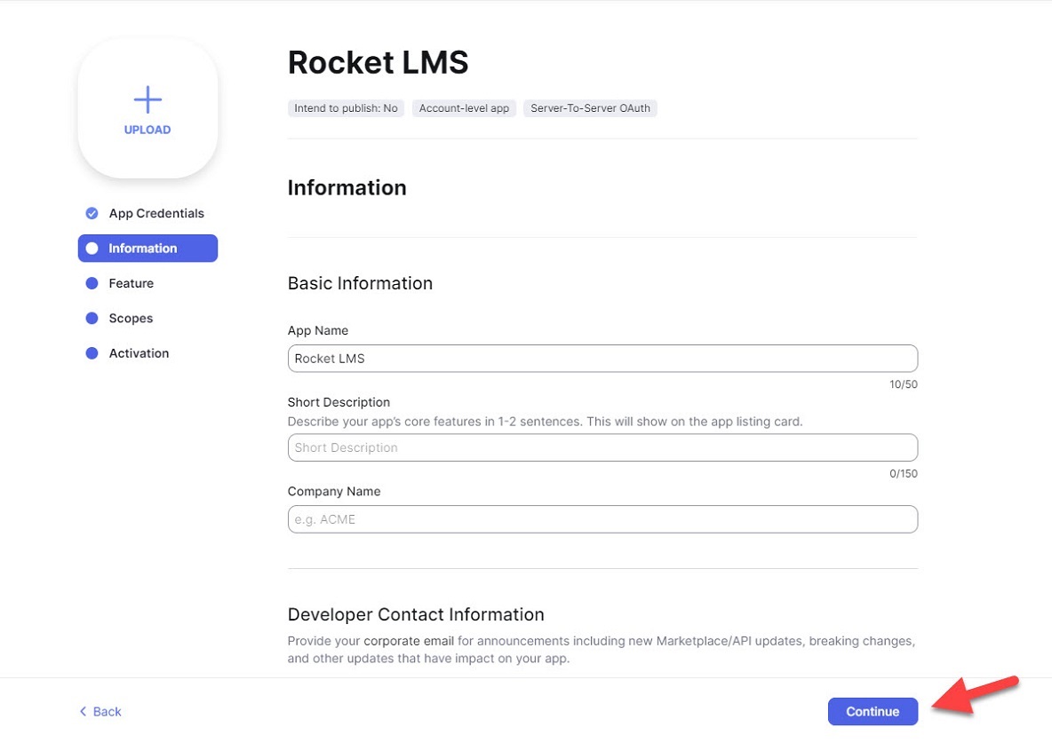 - In the next step, Add information about your app, such as a short description and developer contact information (name and email address required for activation).